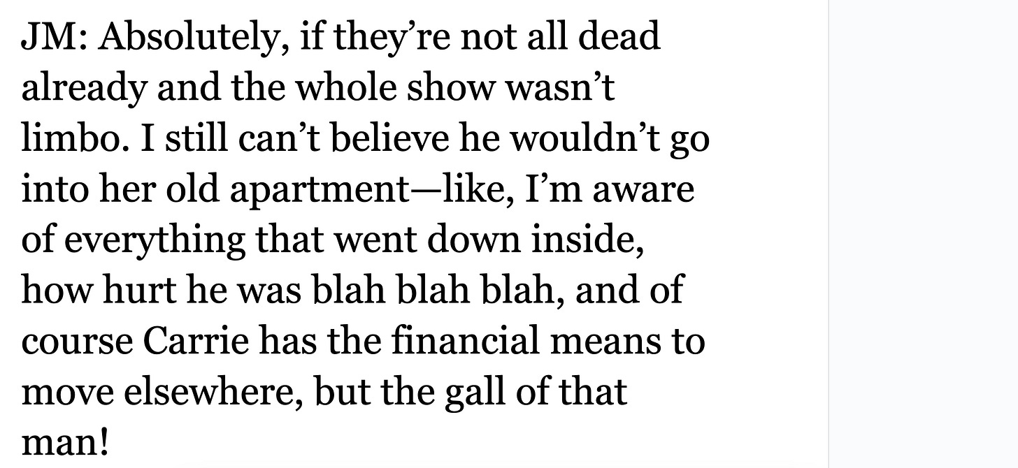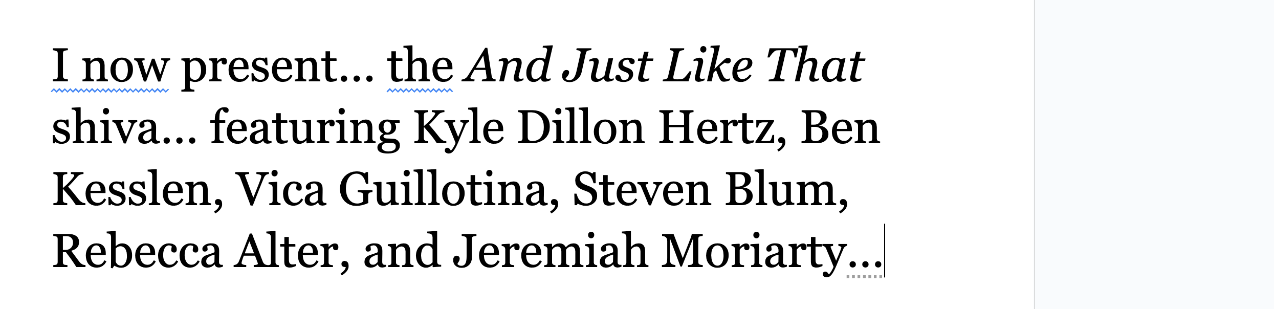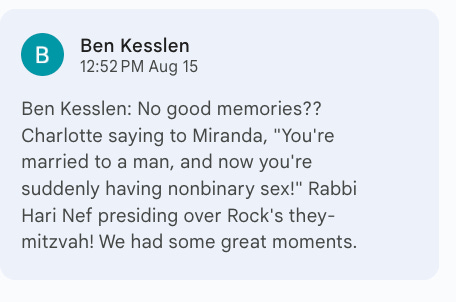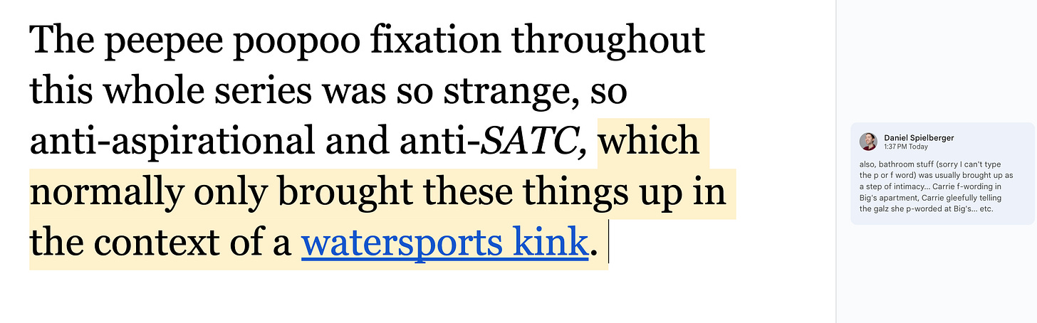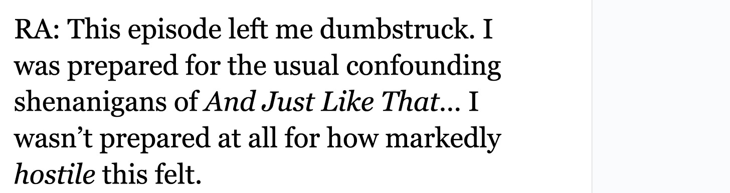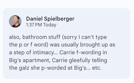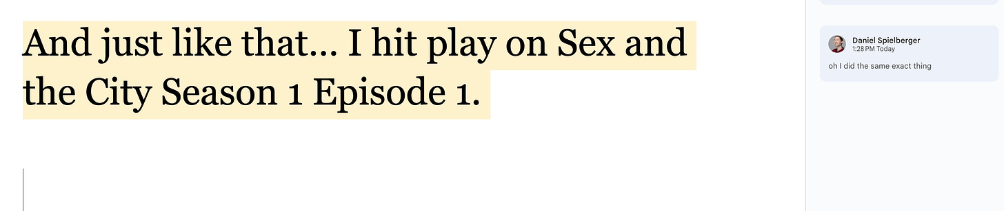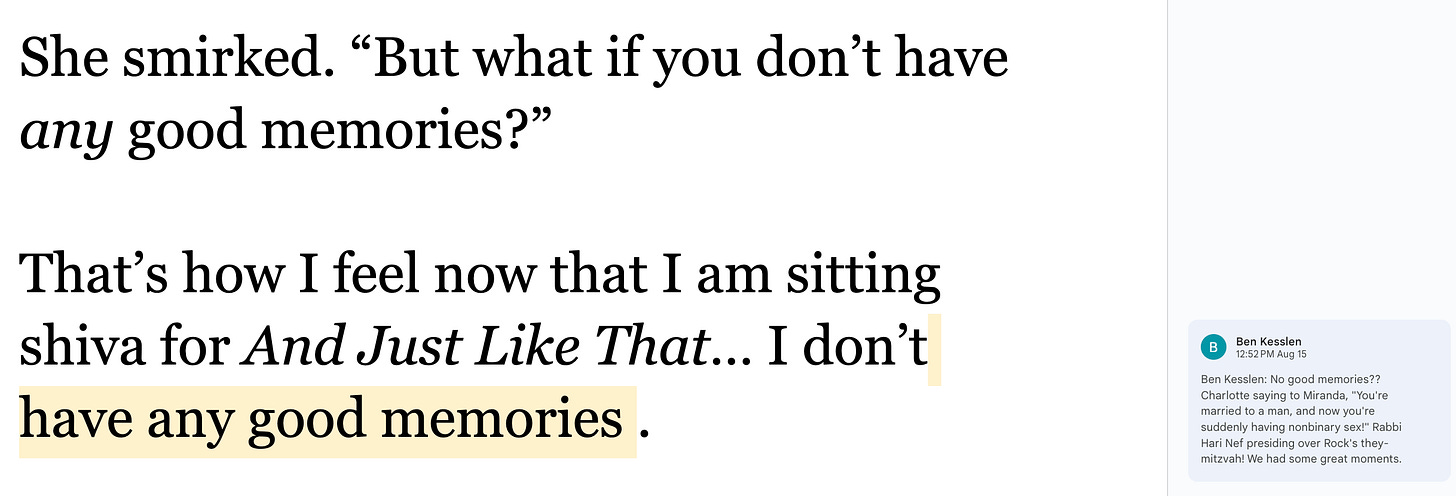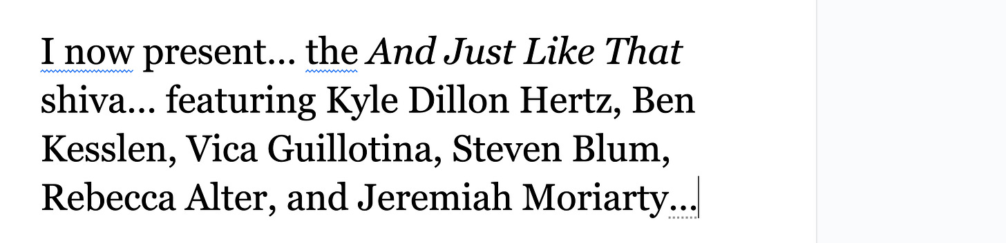 A Daniel Docs Shiva for "And Just Like That..."A space to process, grieve, and remember Daniel SpielbergerAug 21, 2025715ShareThis is another installment of the Daniel Docs Interview series. I send someone a Google Doc of questions and they have 24 hours (or so) to respond with answers and suggested notes on their bio. Do you want a Daniel Doc? Email dspielbe@gmail.com.