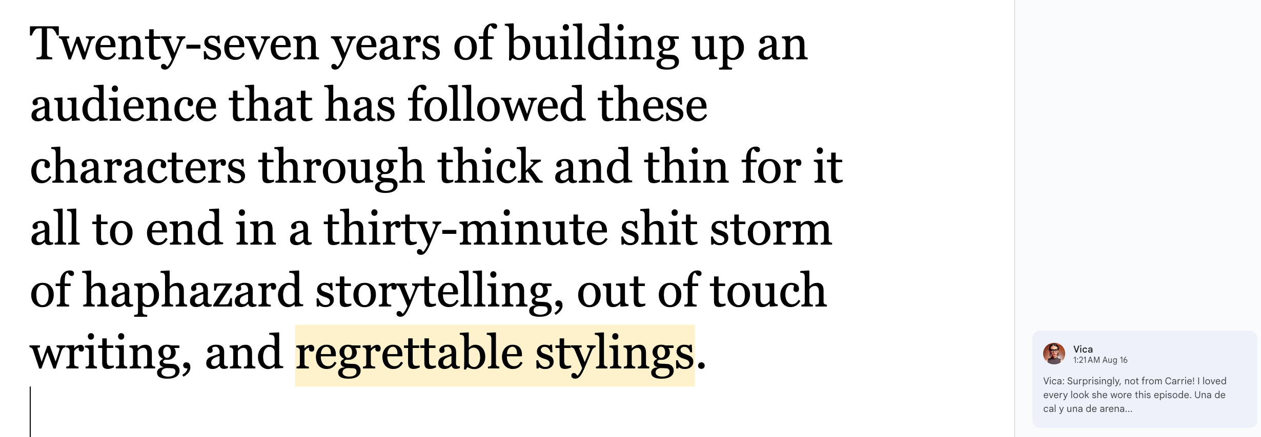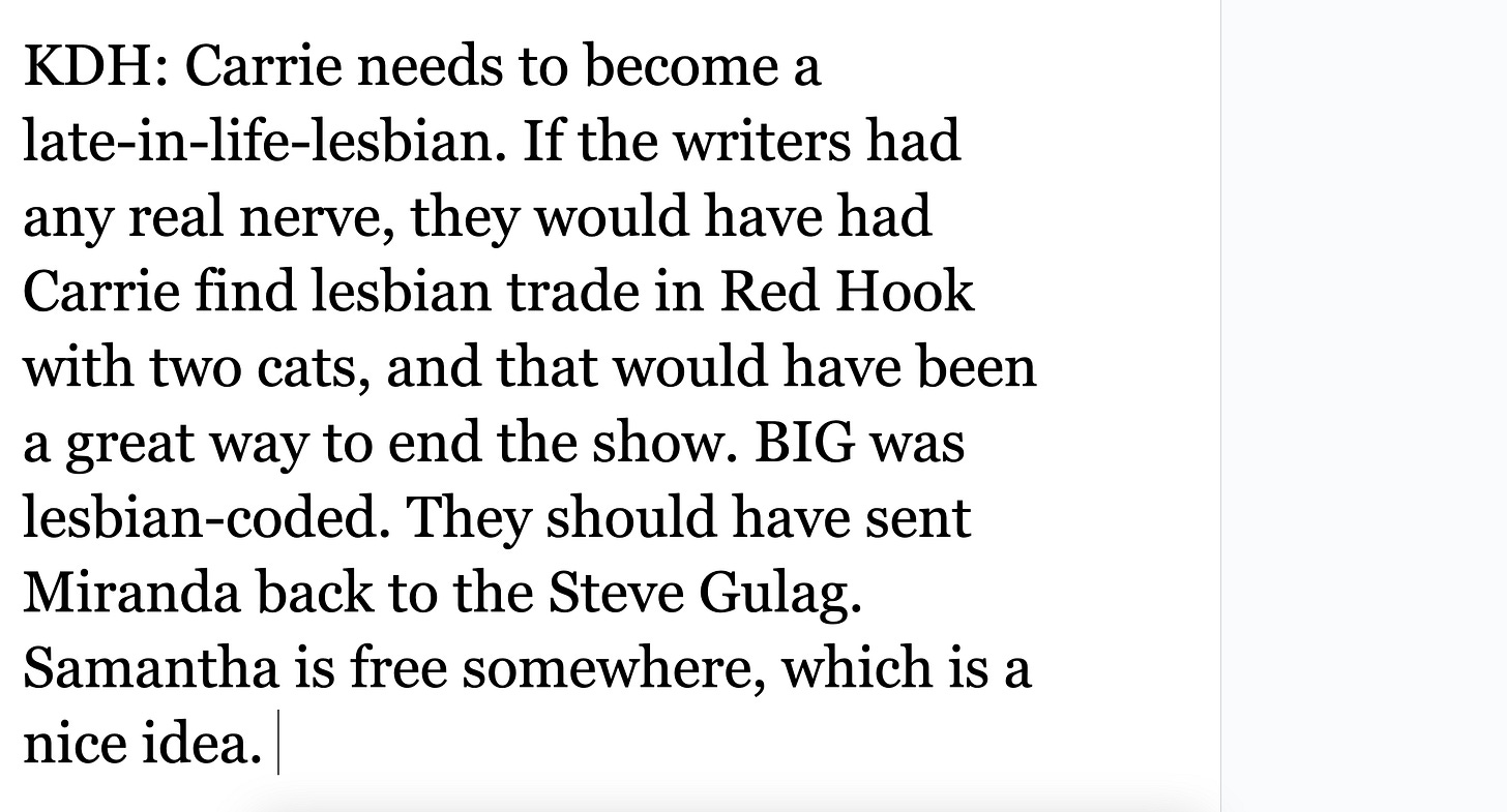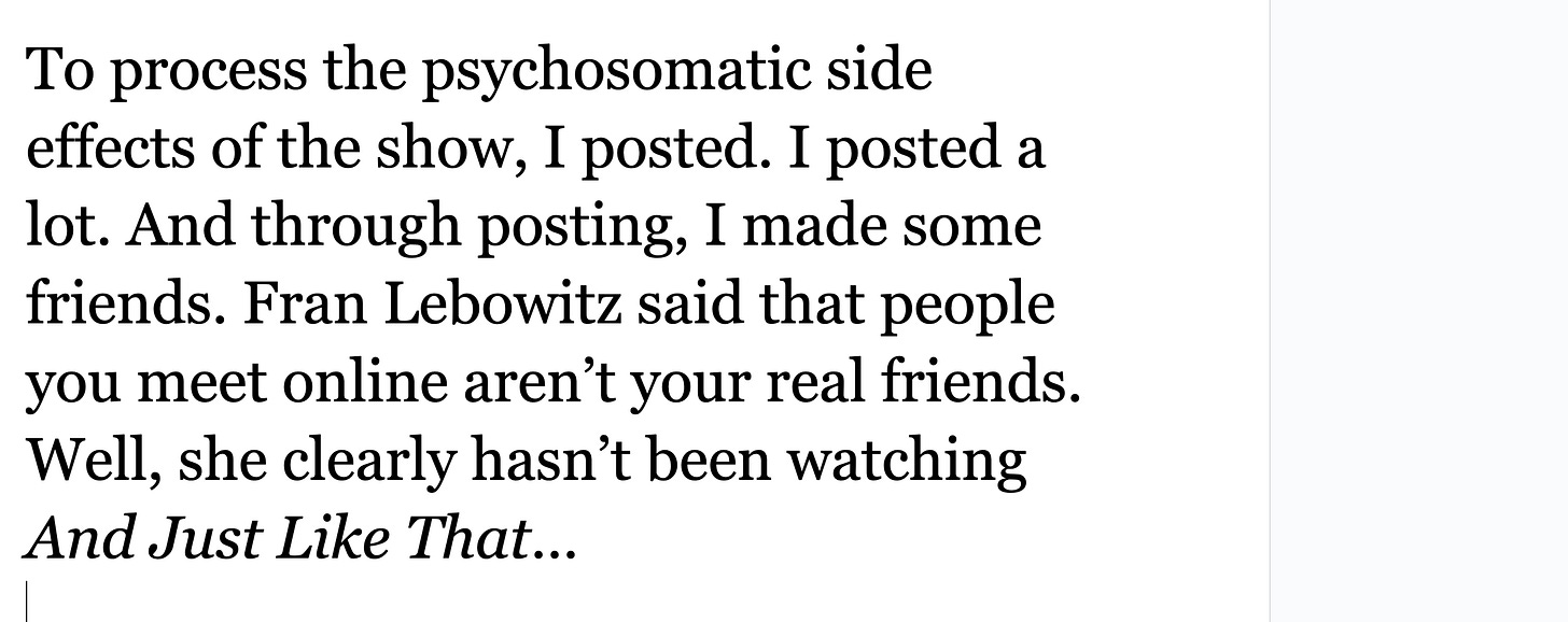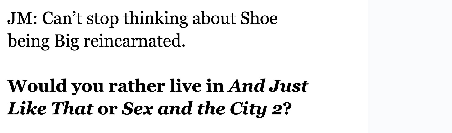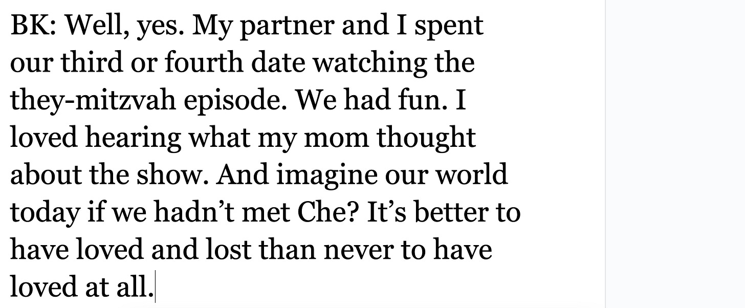 A Daniel Docs Shiva for "And Just Like That..."A space to process, grieve, and remember Daniel SpielbergerAug 21, 2025715ShareThis is another installment of the Daniel Docs Interview series. I send someone a Google Doc of questions and they have 24 hours (or so) to respond with answers and suggested notes on their bio. Do you want a Daniel Doc? Email dspielbe@gmail.com.