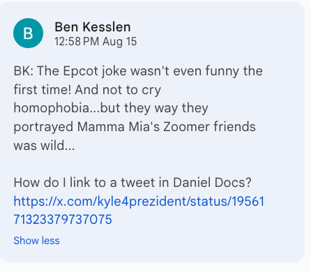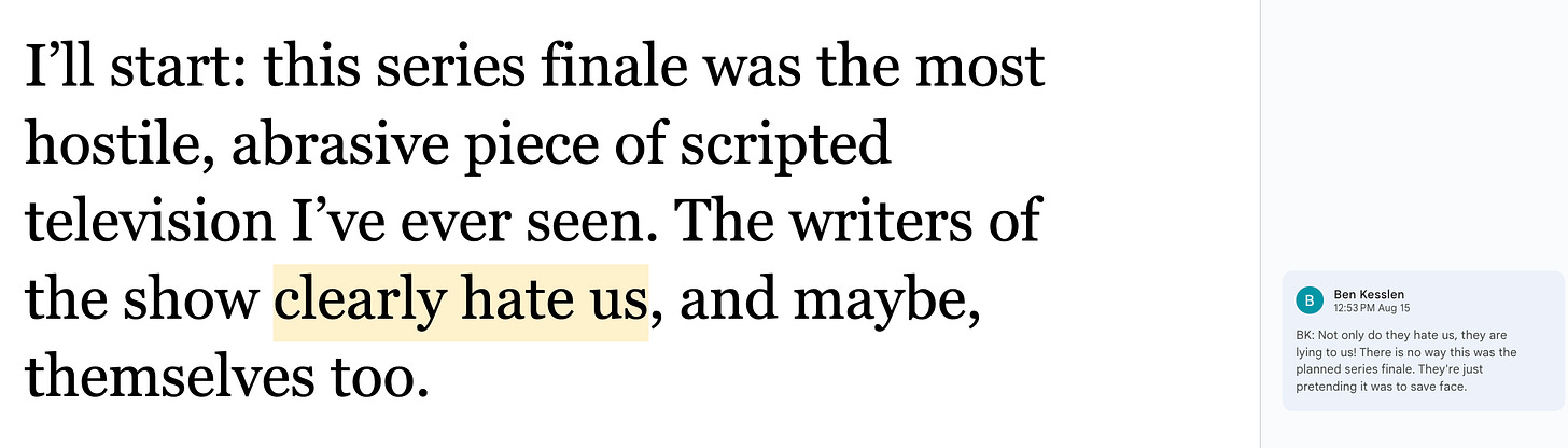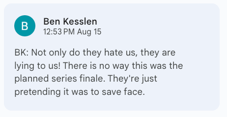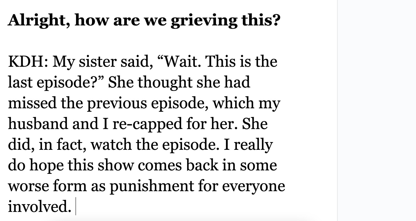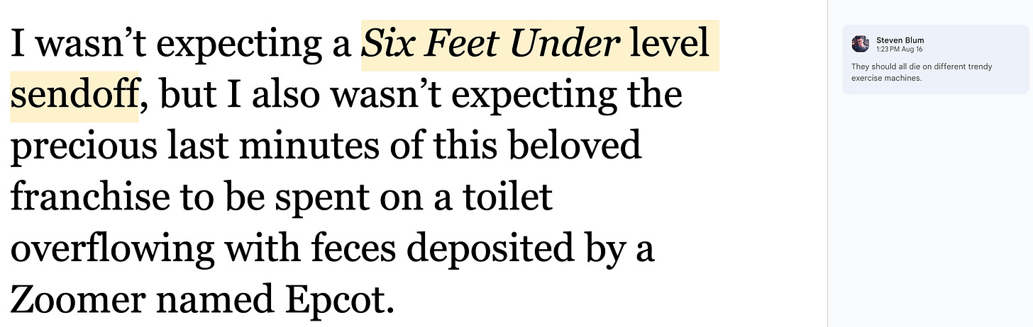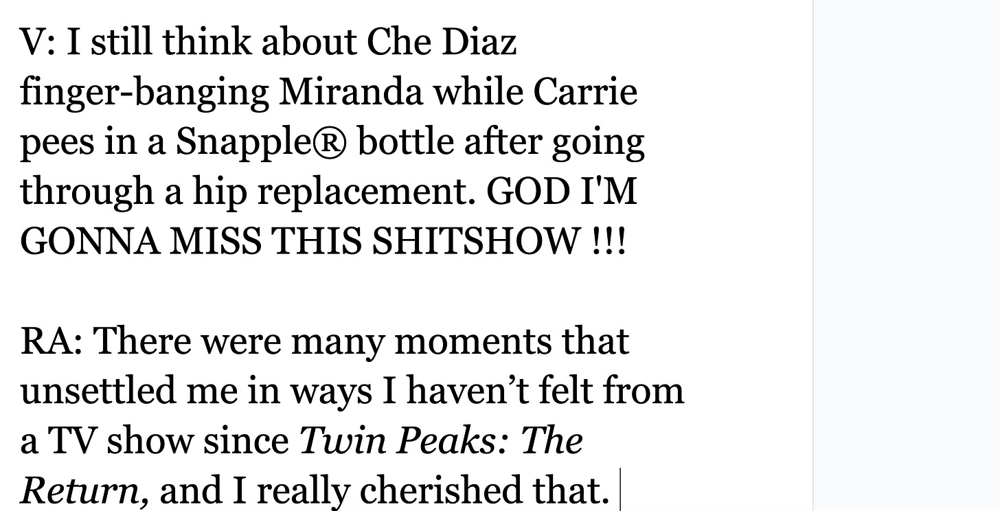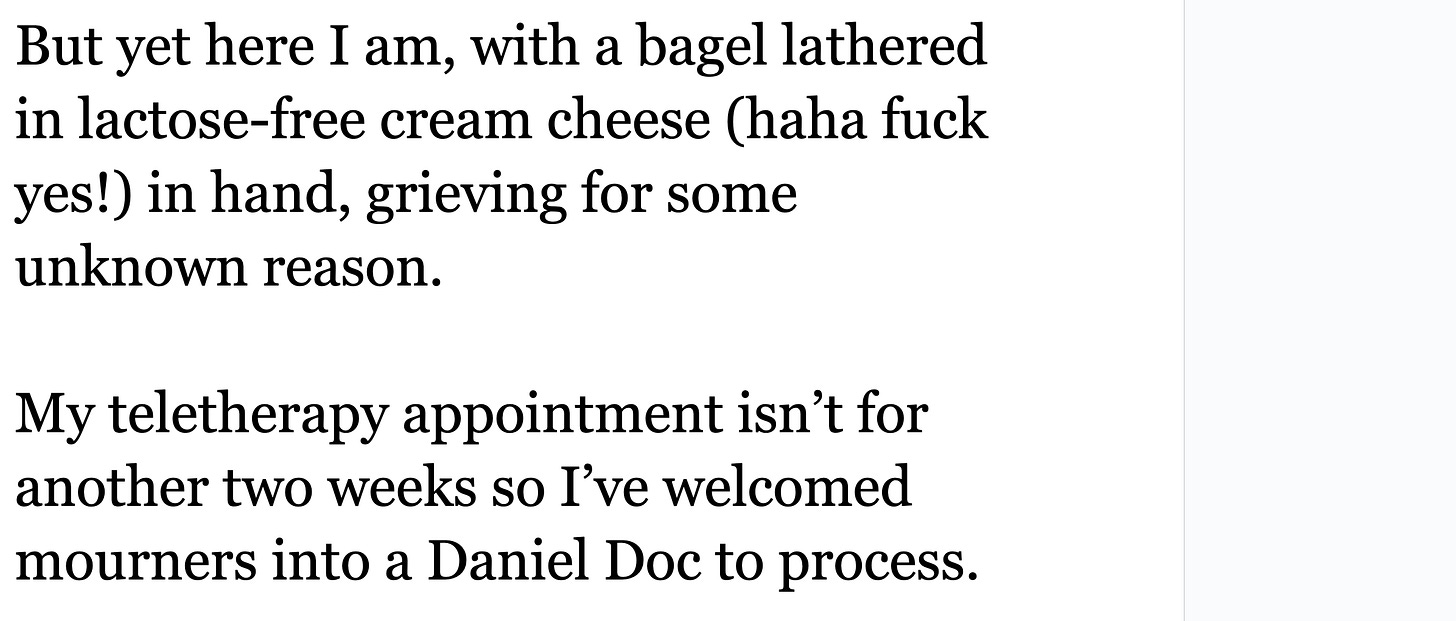 A Daniel Docs Shiva for "And Just Like That..."A space to process, grieve, and remember Daniel SpielbergerAug 21, 2025715ShareThis is another installment of the Daniel Docs Interview series. I send someone a Google Doc of questions and they have 24 hours (or so) to respond with answers and suggested notes on their bio. Do you want a Daniel Doc? Email dspielbe@gmail.com.