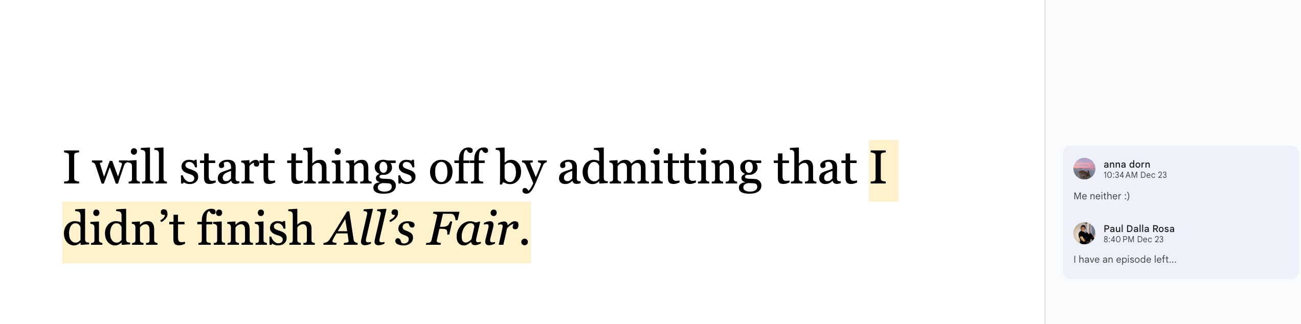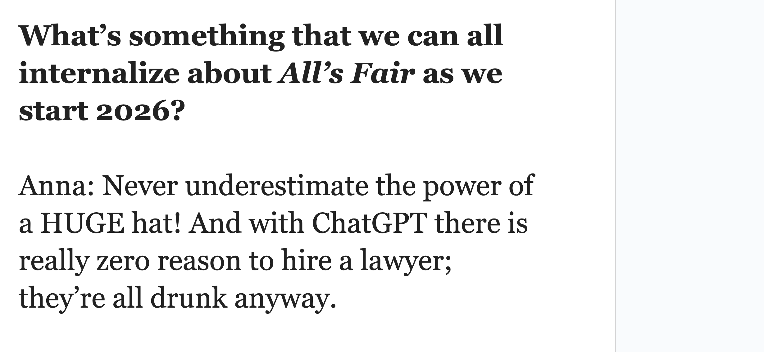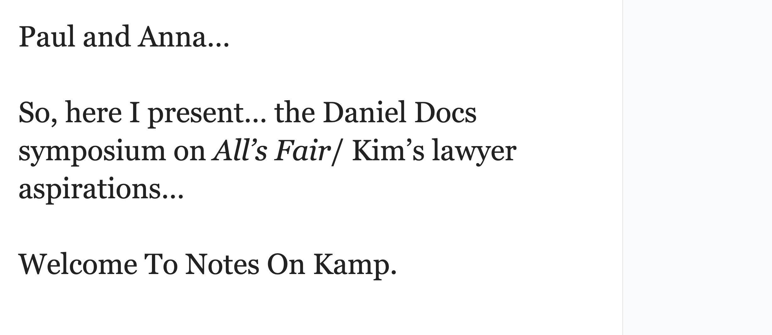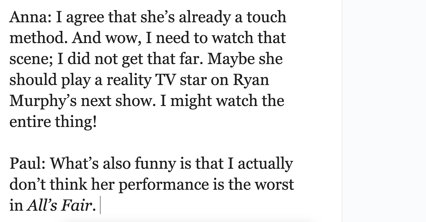 Notes on Kamp: A Symposium on "All's Fair" Anna Dorn and Paul Dalla Rosa chat about last year's worst/best showDaniel SpielbergerJan 02, 20262ShareThis is another installment of the Daniel Docs Interview series. I send someone a Google Doc of questions and they have 24 hours (or so) to respond with answers and suggested notes on their bio. Do you want a Daniel Doc? Email dspielbe@gmail.com.Follow Anna and Paul…