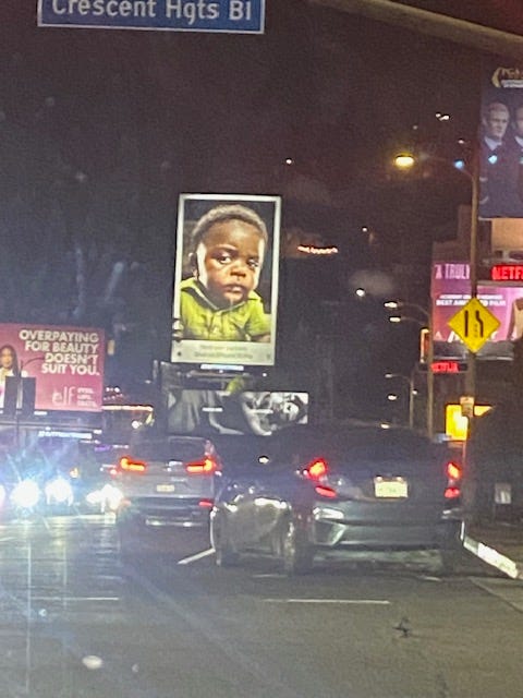 If you’ve driven down the enchanting path that is Sunset Boulevard lately, you’ve likely have been confronted with that baby in the “Shot on iPhone” billboard. I didn’t read this Adweek article I am linking to but I’m assuming that these ads aim to demonstrate the high quality of iPhone cameras and try to make you, the prospective consumer, imagine a future in which your current or hypothetical baby will be photographed by an iPhone. Here’s a low quality photo of the billboard (shot by my iPhone 11 while my partner was driving):