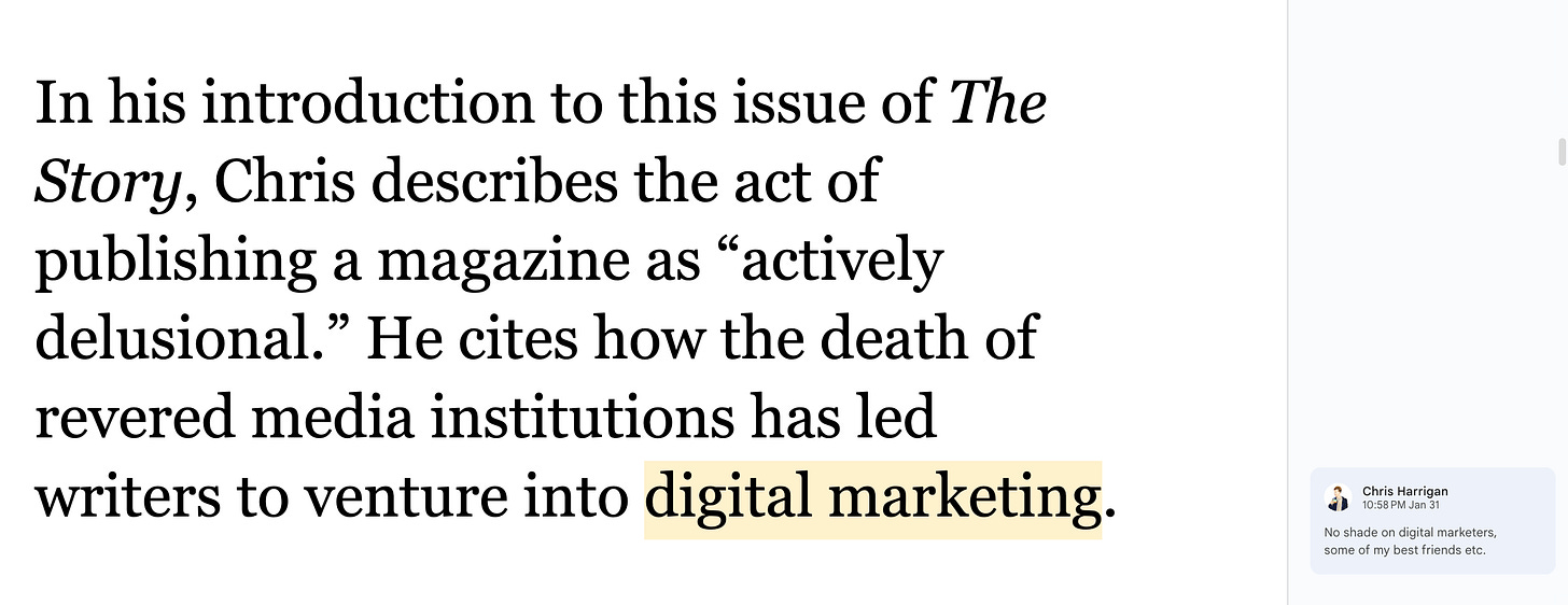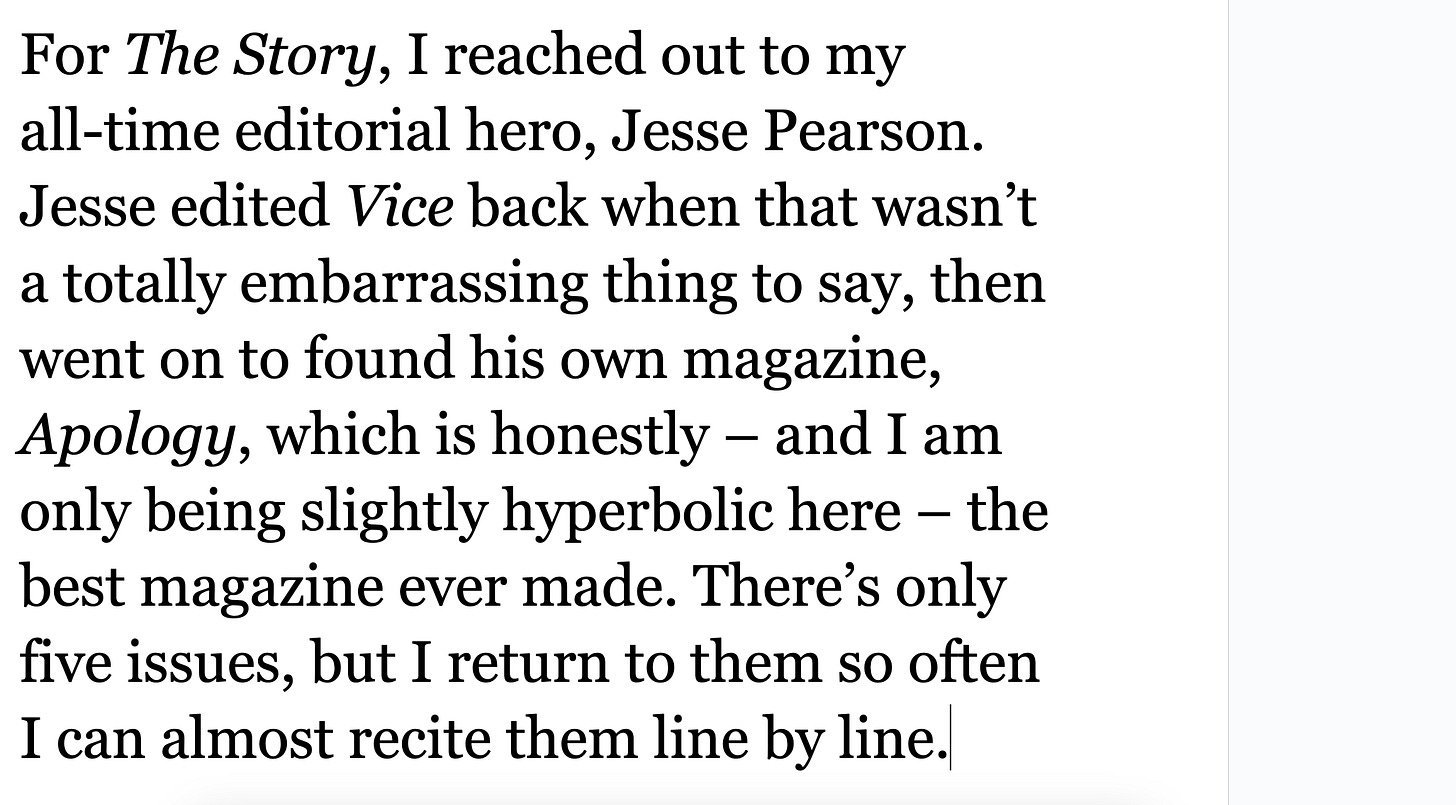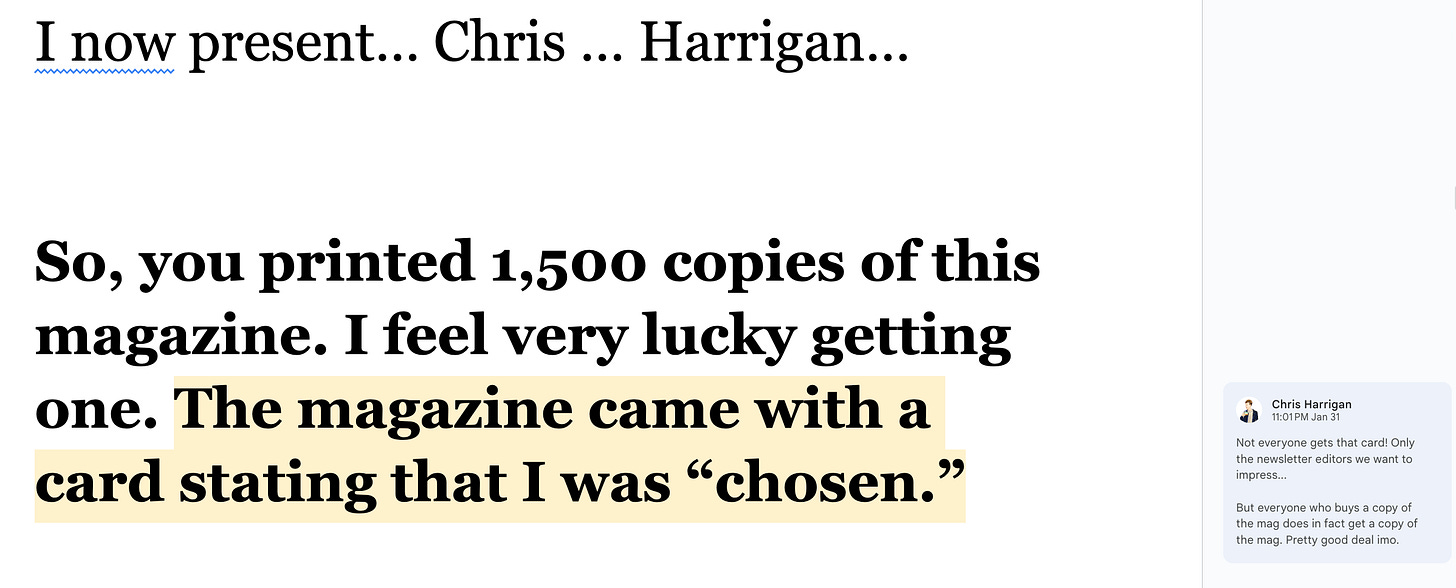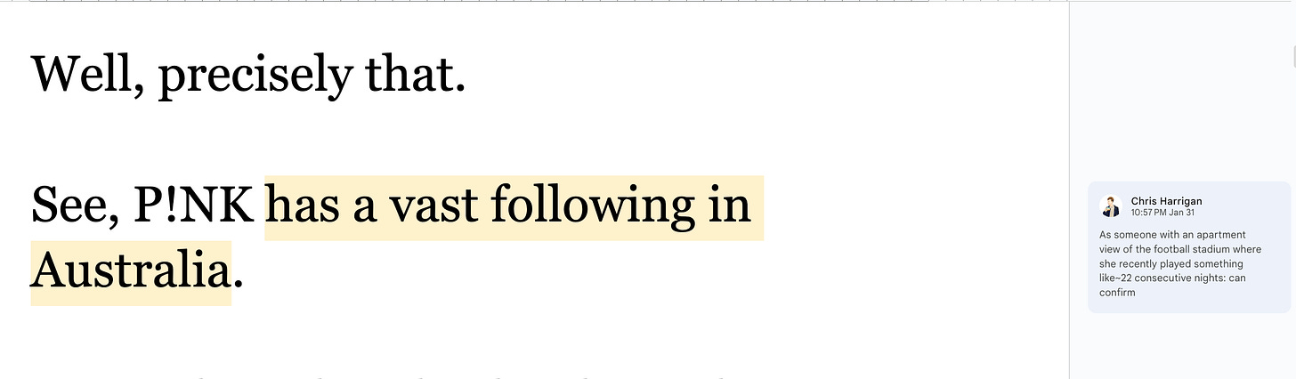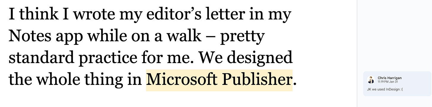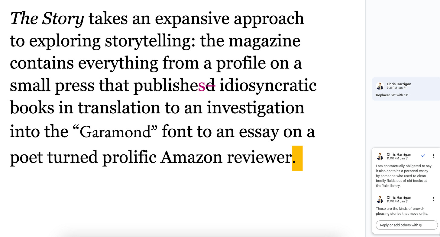 The Daniel Docs Interview: Chris Harrigan"The Story" editor chats about print magazines, P!NK, and Melbourne Daniel SpielbergerFeb 04, 2026411ShareThis is another installment of the Daniel Docs Interview series. I send someone a Google Doc of questions and they have 24 hours (or so) to respond with answers and suggested notes on their bio. Do you want a Daniel Doc? Email dspielbe@gmail.com.This magazine survived the tariffsLearn more about The Story , Subscribe to The Story