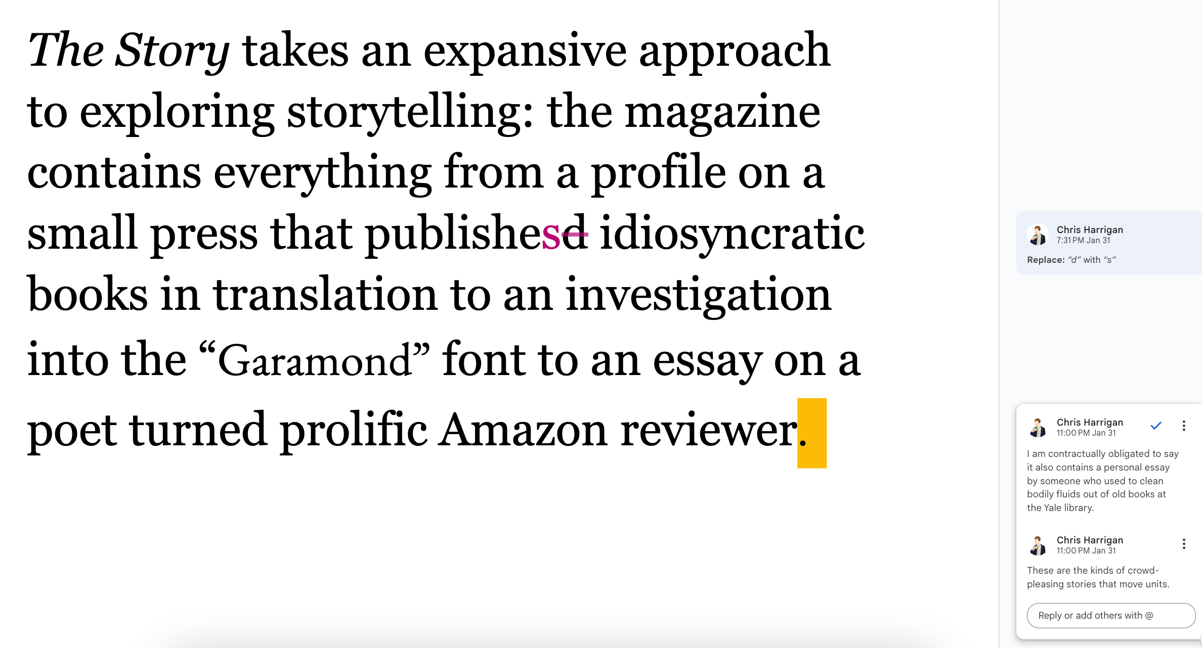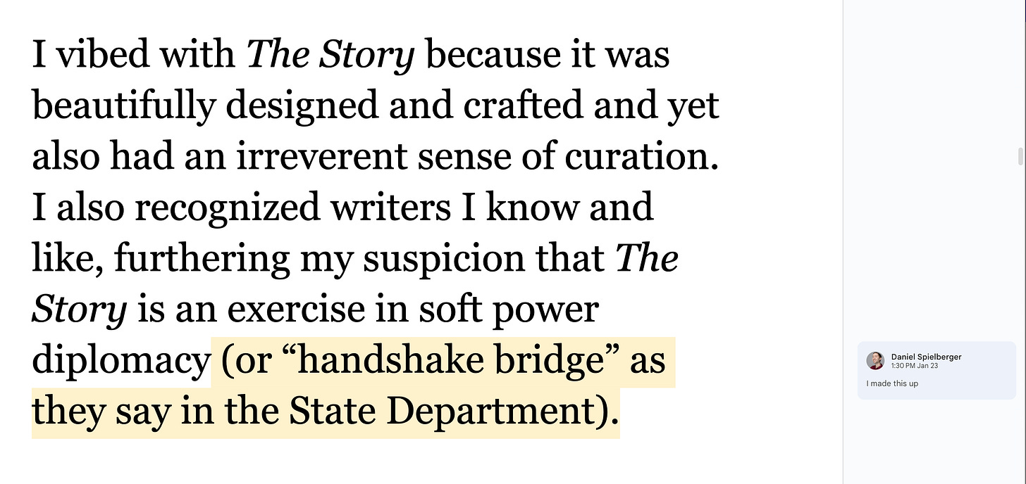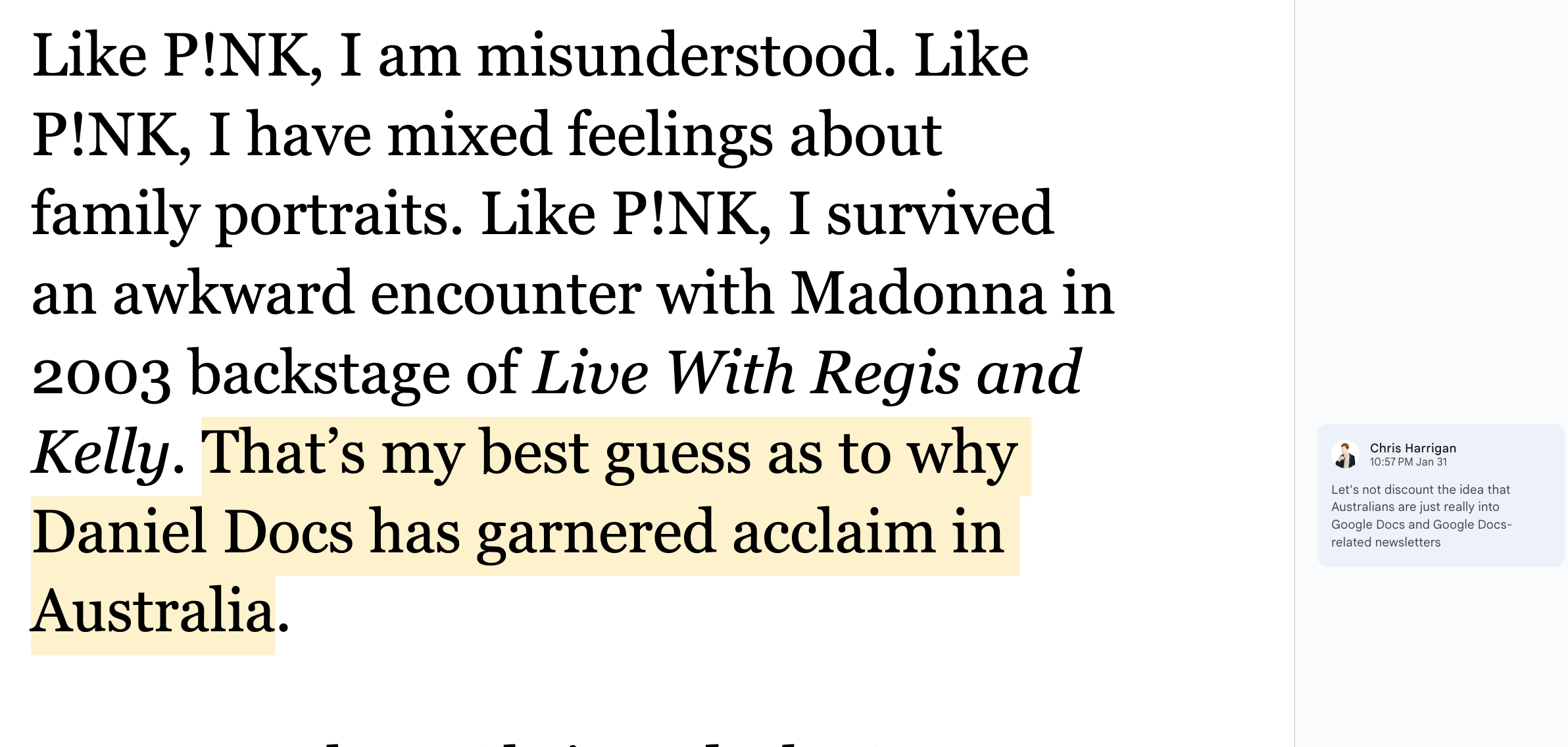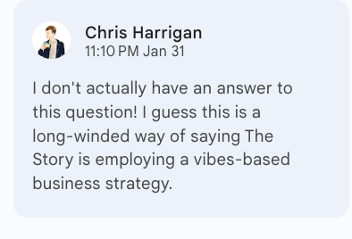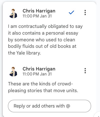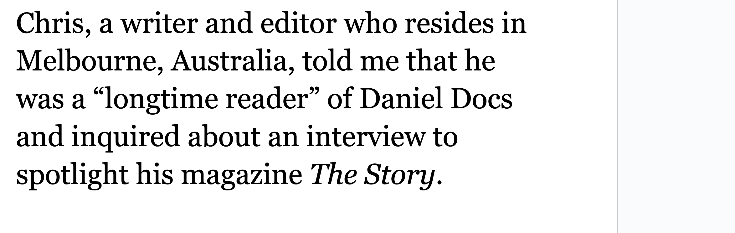 The Daniel Docs Interview: Chris Harrigan"The Story" editor chats about print magazines, P!NK, and Melbourne Daniel SpielbergerFeb 04, 2026411ShareThis is another installment of the Daniel Docs Interview series. I send someone a Google Doc of questions and they have 24 hours (or so) to respond with answers and suggested notes on their bio. Do you want a Daniel Doc? Email dspielbe@gmail.com.This magazine survived the tariffsLearn more about The Story , Subscribe to The Story