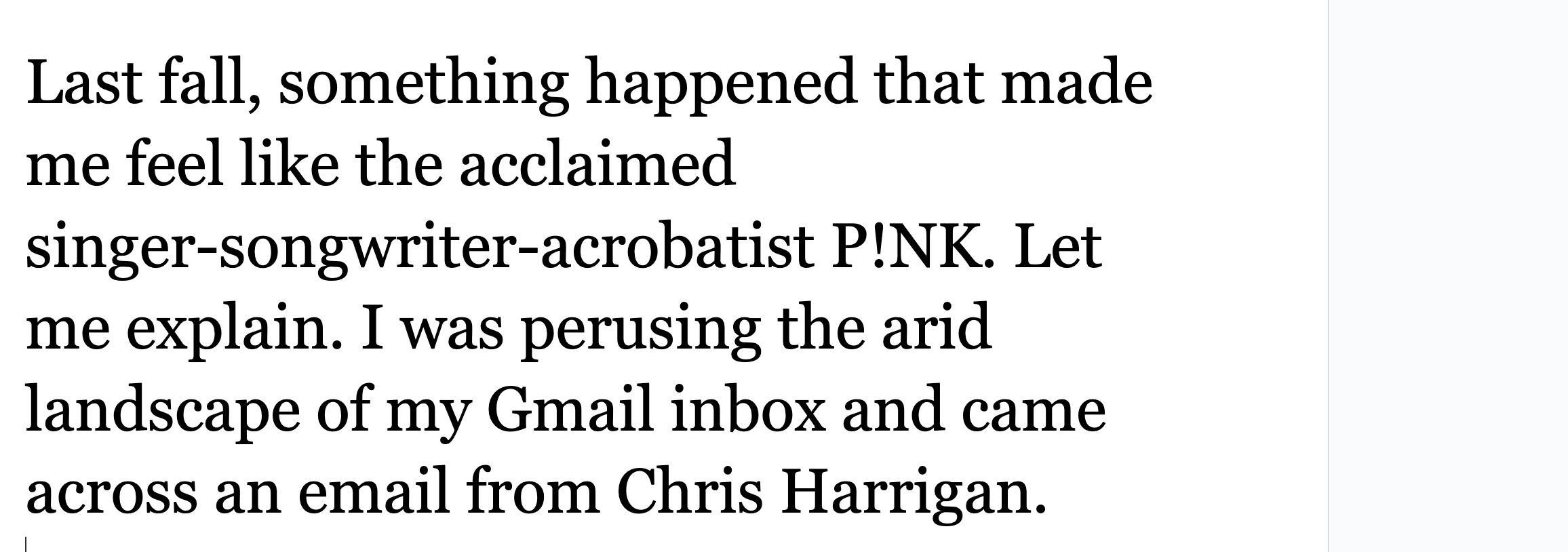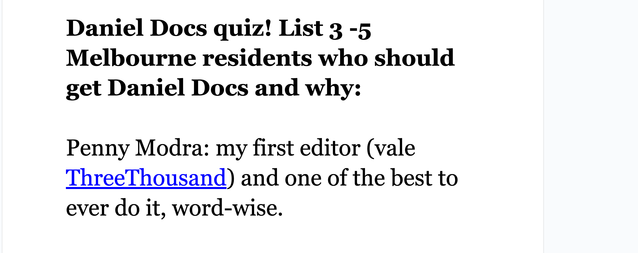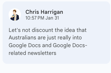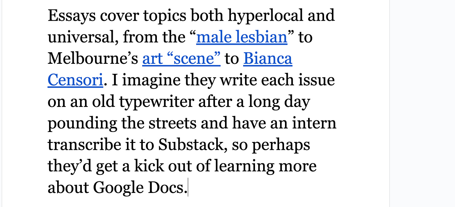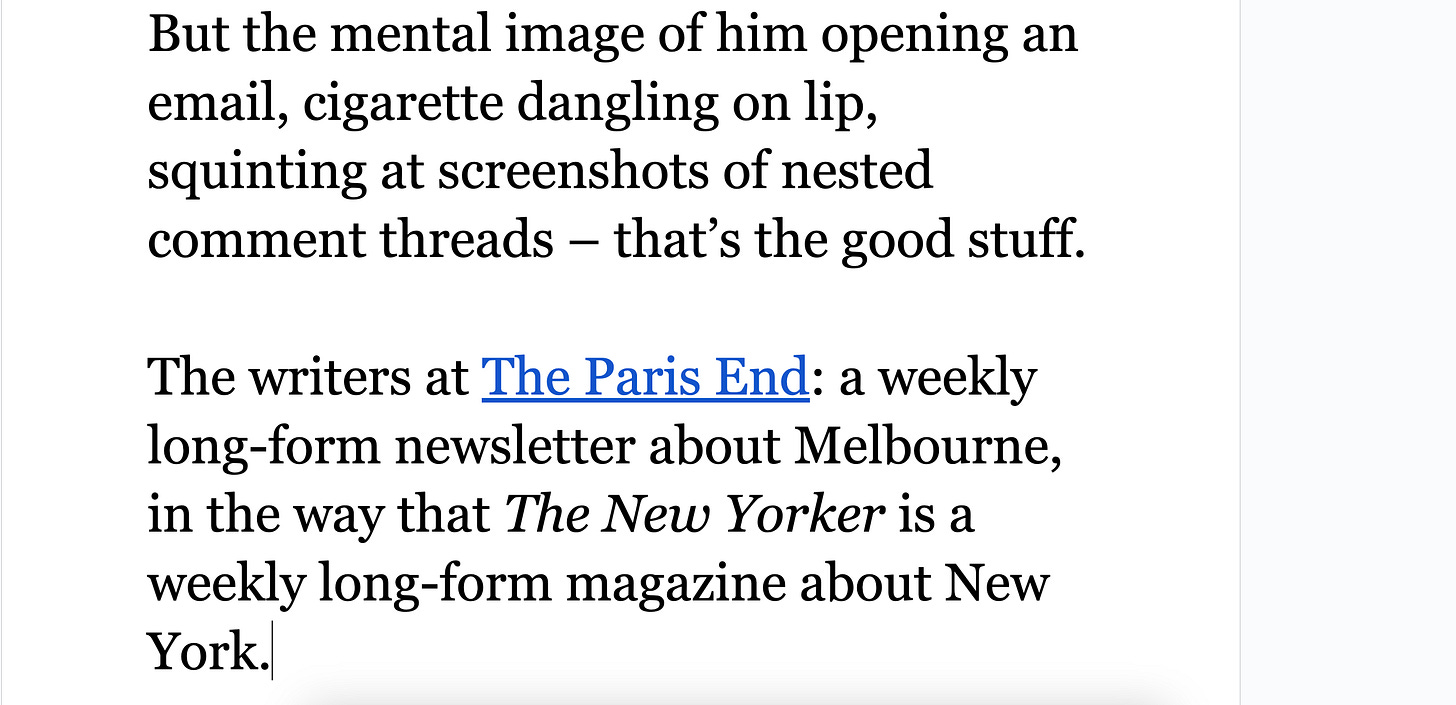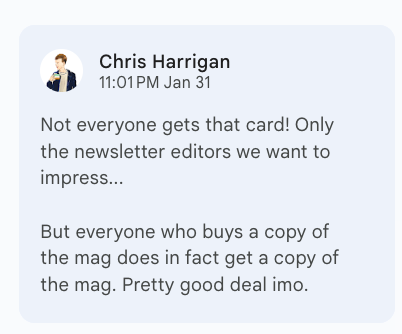 The Daniel Docs Interview: Chris Harrigan"The Story" editor chats about print magazines, P!NK, and Melbourne Daniel SpielbergerFeb 04, 2026411ShareThis is another installment of the Daniel Docs Interview series. I send someone a Google Doc of questions and they have 24 hours (or so) to respond with answers and suggested notes on their bio. Do you want a Daniel Doc? Email dspielbe@gmail.com.This magazine survived the tariffsLearn more about The Story , Subscribe to The Story