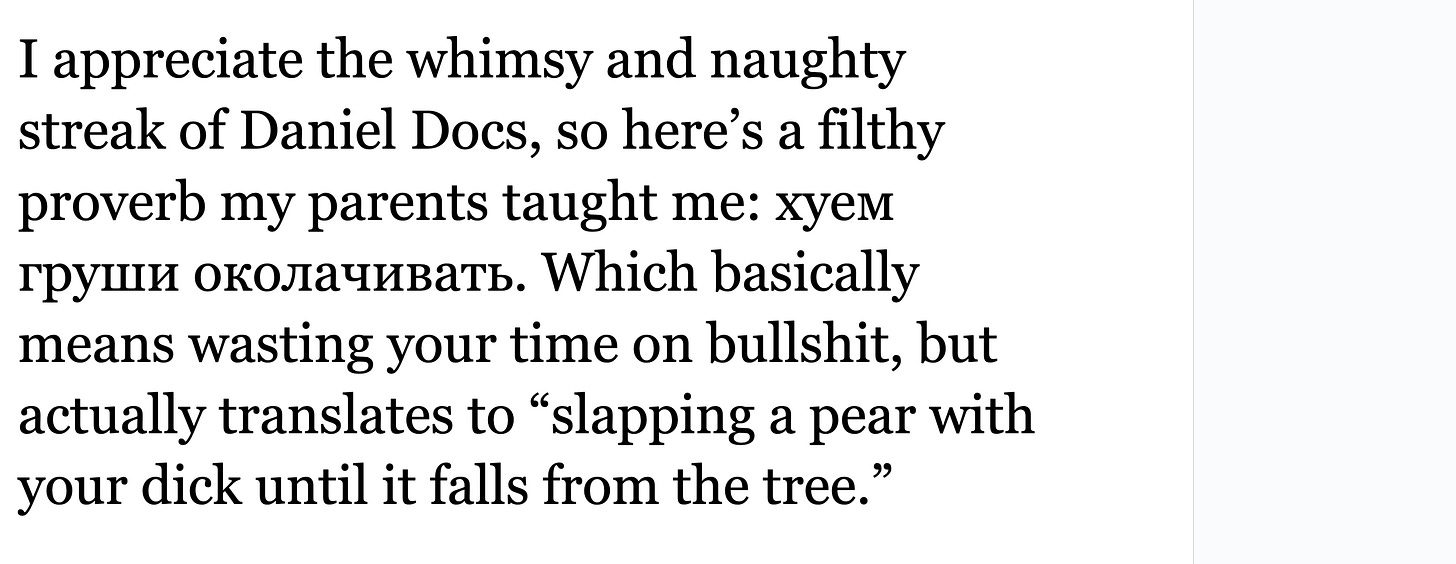 The author shares a famous Russian proverb: "хуем груши околачивать"