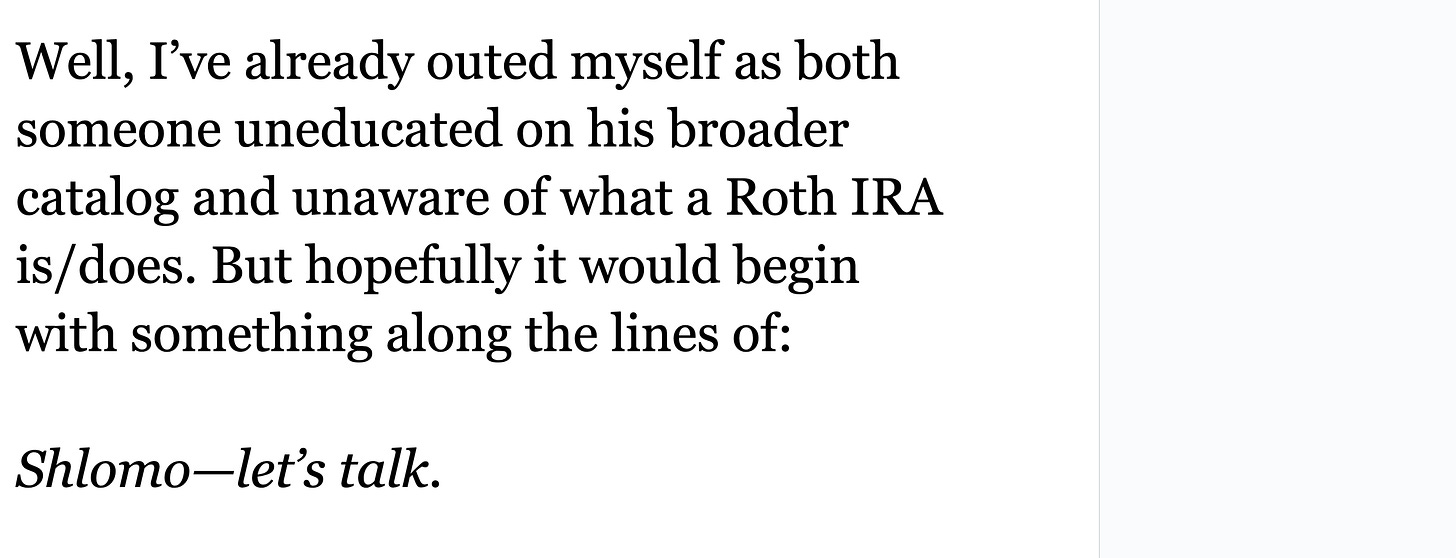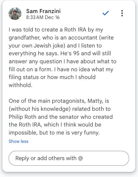 The writer chats about Roth IRAs, "Puppies," and polycules